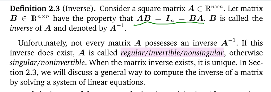 Unfortunately, not every matrix A possesses an inverse A−1. If this inverse does exist, A is called regular/invertible/nonsingular, otherwise singular/noninvertible.