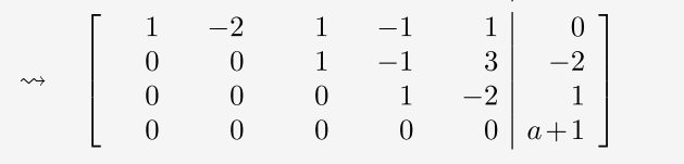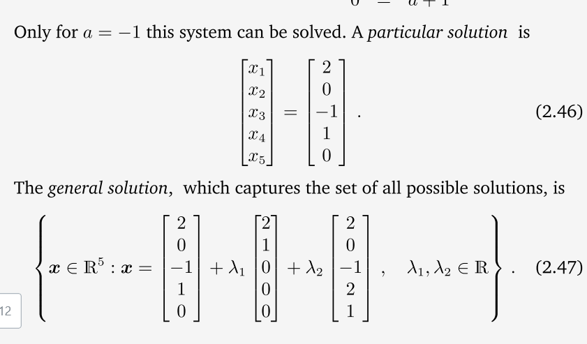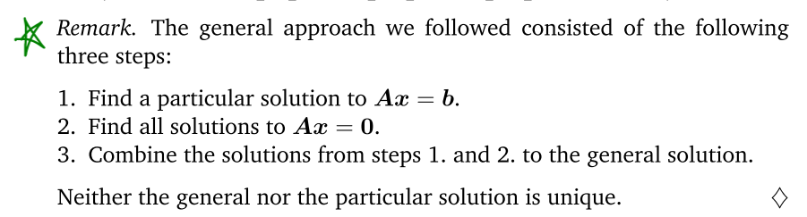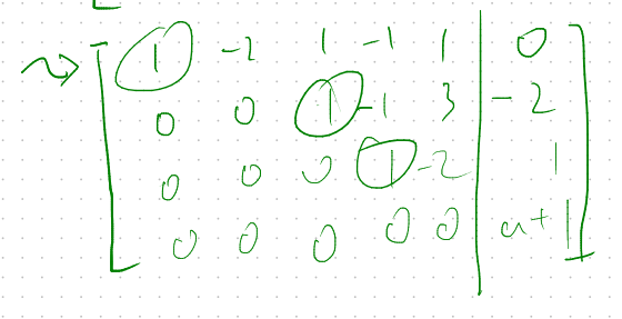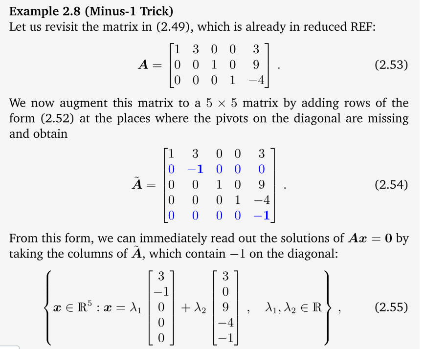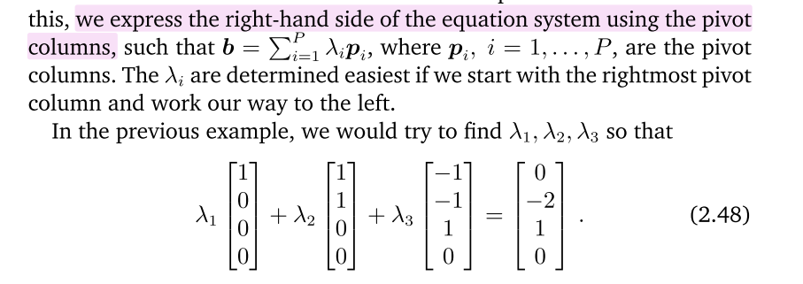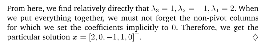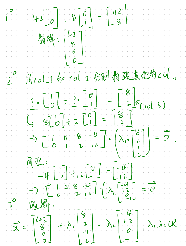 借助row-echelon form可以帮助我们找到特解。 因为上面例子中的pivot为x1, x3, x4, 因此令augmented matrix中的这三列的线性组合等于向量b。