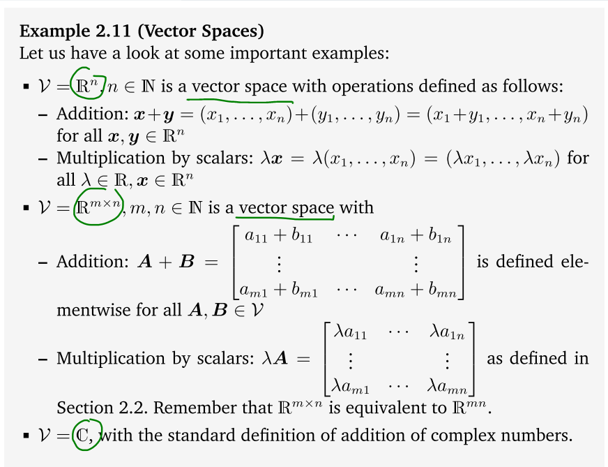 向量、矩阵和虚数的集合都是vector space,因为满足上面的性质。