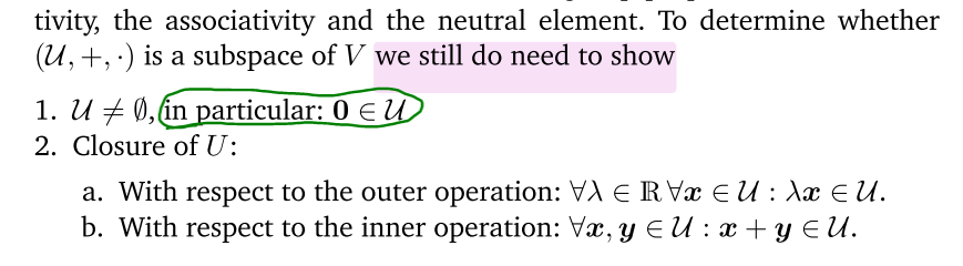Intuitively, they are sets contained in the original vector space with the property that when we perform vector space operations on elements within this subspace, we will never leave it. In this sense, they are “closed”.