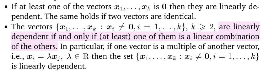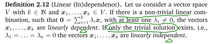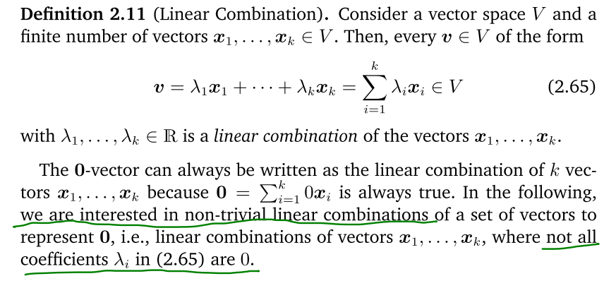 线性独立、线性相关是借助\(0=\sum^k_{i=1}\lambda_ix_i\)来定义的。