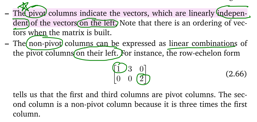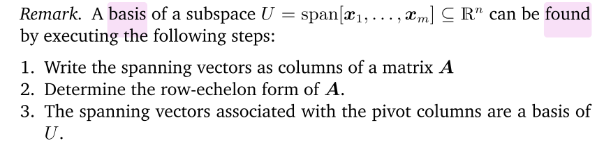 将spanning vector写成矩阵A,A的echelon form pivot对应的column就是这个subspace的basis。
