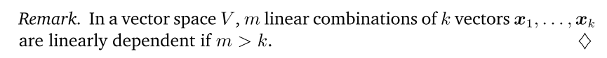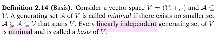 线性独立的generating set最小,称为这个向量空间V的一个basis。