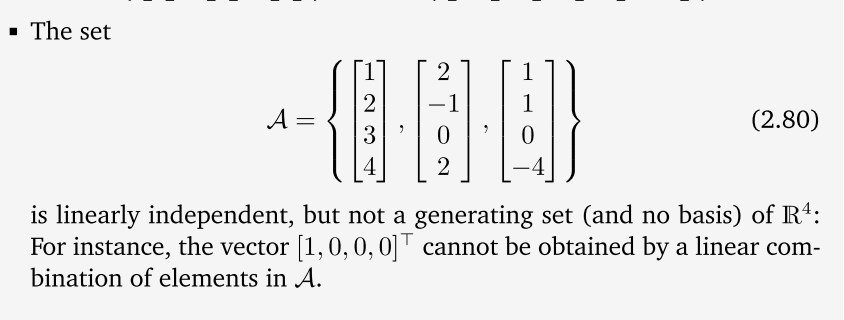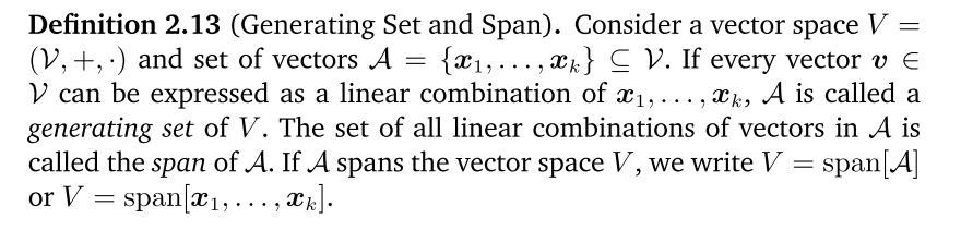 如果一个vector space中的所有向量都可以用集合A中的向量线性组合得到,称A为V的generating set,V为A的span。