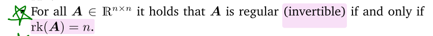 对于n*n 的方阵,矩阵可逆当且仅当rank=n。