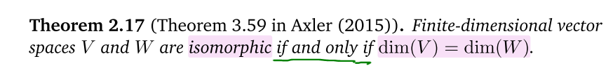V和W同构(线性映射+双射)<=> dim(V) = dim(W).