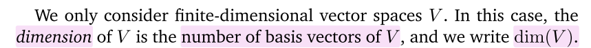 对于finite-dimensional vector spaces V,V的维度就等于V的basis vector的个数。