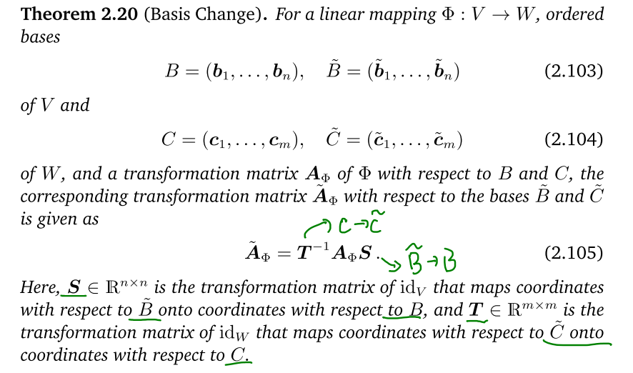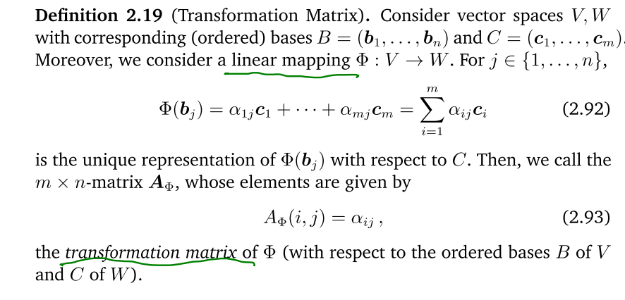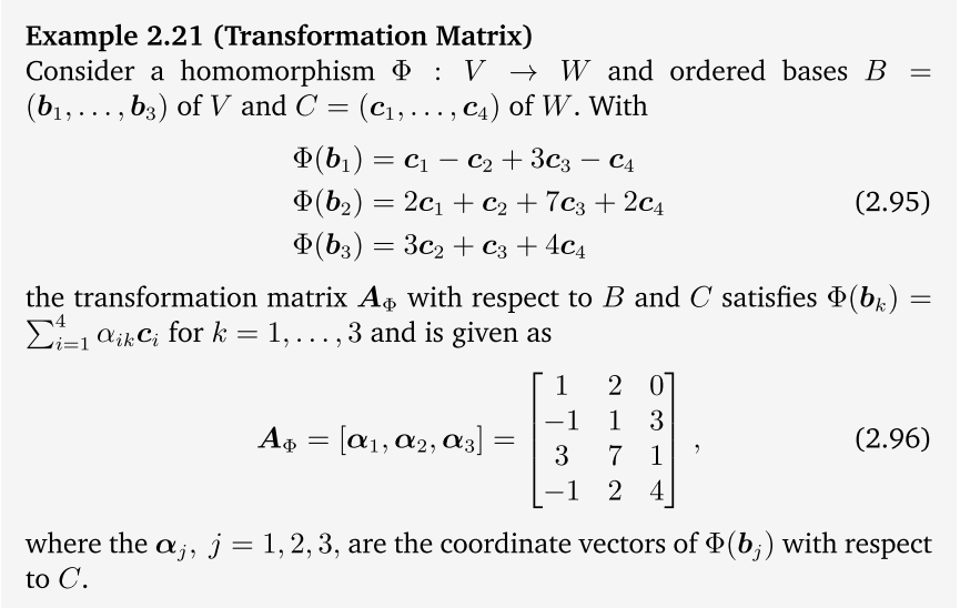 我们将V的每一个basis b 的映射后的向量\(\Phi(b_j)\)都表示为W的basis c的线性组合。