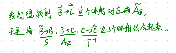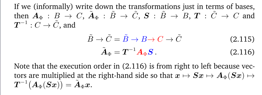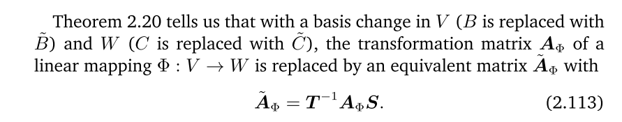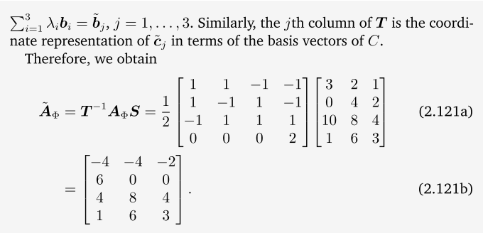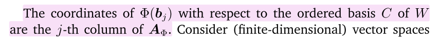 换句话说,\(b_j\)是起点,是自变量。\(\Phi(b_j)\)是终点,是因变量。而我们想要用某种形式把这个映射过程记录下来,因此就记录下\(\Phi(b_j)\)相对于basis c的坐标。这样一来,我们就将整个映射的过程“翻译”成了相对于basis c的坐标,记录到矩阵A中。