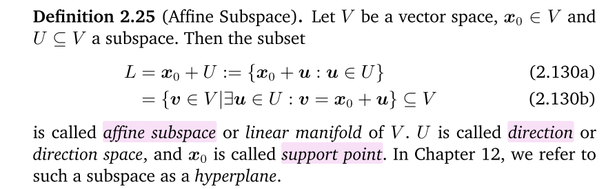 则\(x_0\)加上U中任一向量得到的结果的集合就称为affine subspace或者linear manifold。