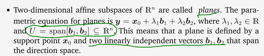 U是两个线性独立的basis所张成的span,然后\(x_0\)与U相加得到的affine subspace就是一个平面。