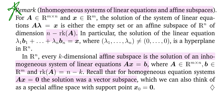 Inhomogeneous systems of linear equations Ax=b对应的是一个维度为n-rk(A)的affine subspace,