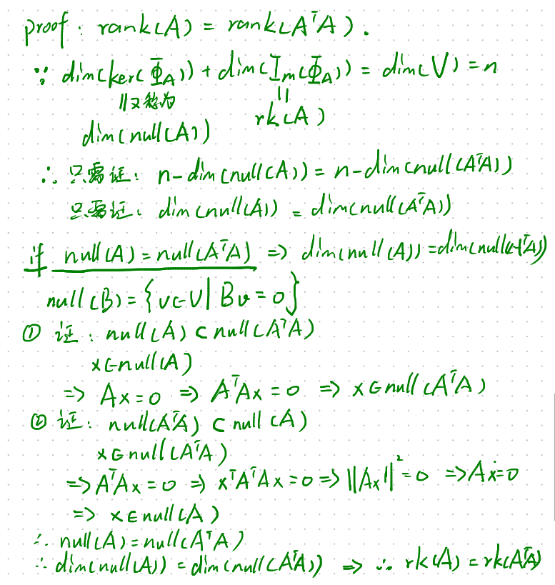 另外用上图中的思路其实可以证明: \(rk(A)=rk(A^T)=rk(A^TA)=rk(AA^T)\). 这是一个挺常用的结论。 就不证明了,了解思路就行。