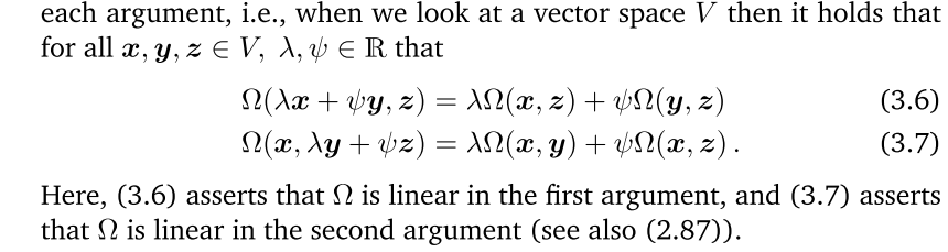 接下来用到的映射\(\Omega\) 有两个argument,并且对每个argument都是linear的,称为bilinear mapping。