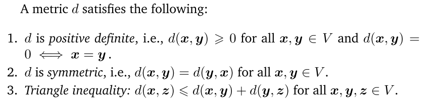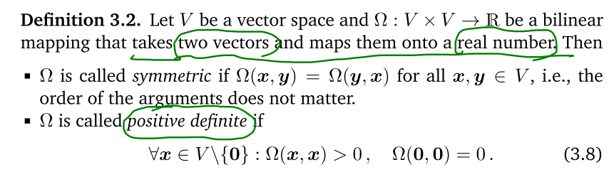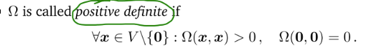 假设\(\Omega\) 是一个\(V\times V \to R\) 的bilinear mapping,将同一个向量空间中的两个向量映射为一个实数, 当两个argument的顺序不重要的时候,称\(\Omega\) 是symmetric的。 如果\(\Omega\)满足:只要x不是0向量,\(\Omega(x,x)\)就一定大于0;\(\Omega(0,0)=0\). 就称\(\Omega\)是positive definite的。
