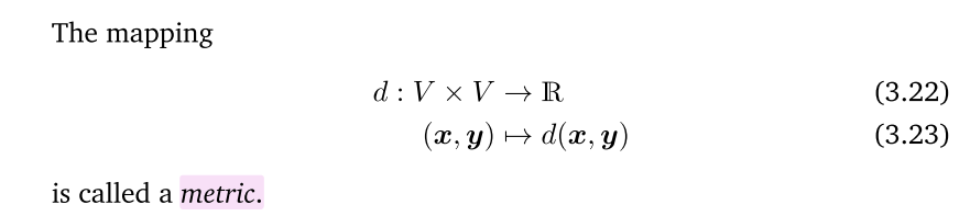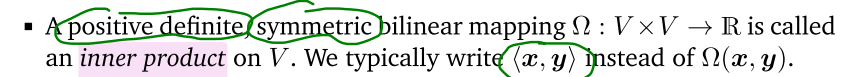 A positive definite, symmetric bilinear mapping \(\Omega\) 被称为V上的inner product。(正定+对称).