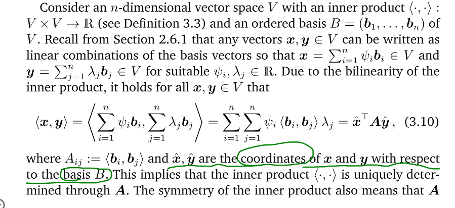 \(\hat{x}\)和\(\hat{y}\)是向量x和y相对于B的坐标,也就是说inner product本质上其实是A决定的。