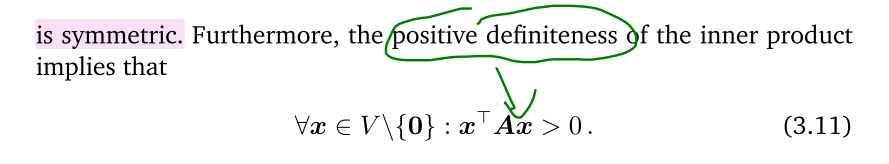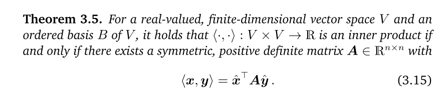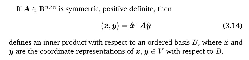 如果已知A是一个symmetric, positive definite矩阵了(对称,对非零向量\(x^TAx>0\)),则\(\hat{x}^TA\hat{y}\)就是V上的一个inner product运算。