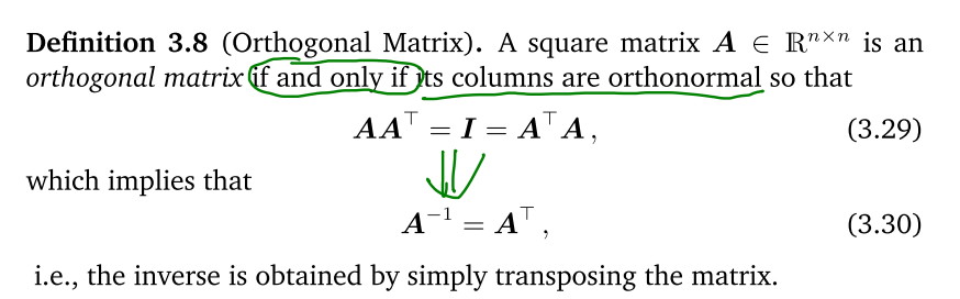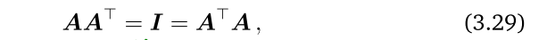 注意: 根据上面的定义,虽然我们叫A“orthogonal matrix”,但其实A是“orthonormal”的,这只是命名的问题,有点怪。 注意以后提到“orthogonal matrix”,就隐含了每个column都是orthonormal的,是单位矩阵。