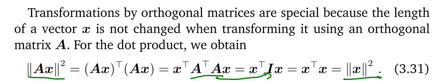 由下面这个式子可以看出,某一向量x在经过一个orthogonal matrix的变换之后,其norm不会改变,本质上是因为\(A^TA=I\)。