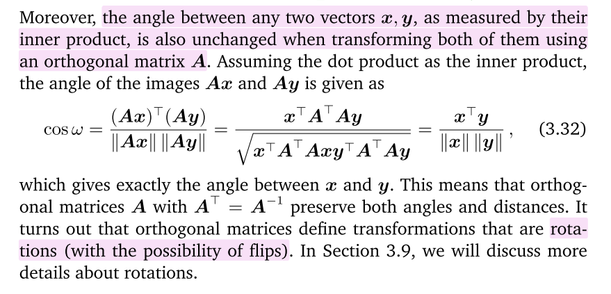此外,由下面这个式子可以看出,对x、y同时施加orthogonal matrix的变换,变换前后两个向量的夹角也不会改变。