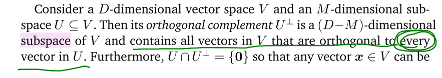 则V中那些与U中所有向量都正交的向量组成的集合(准确的说是子空间),就是U的orthogonal complement \(U^\perp\).