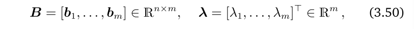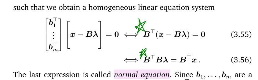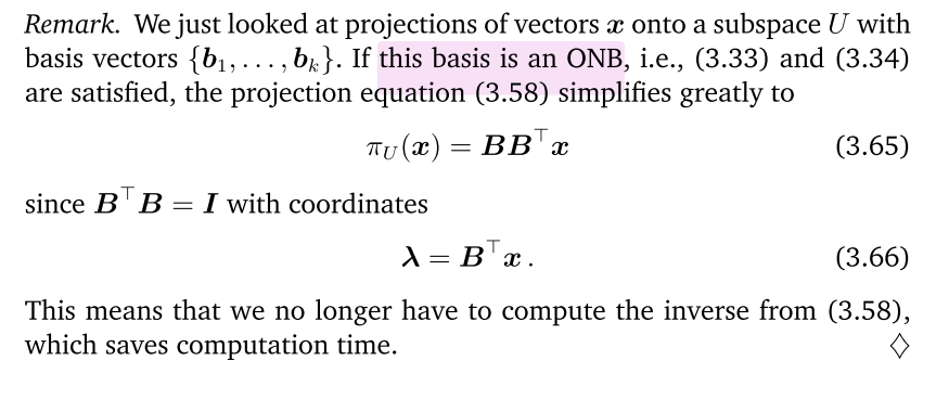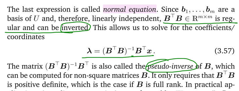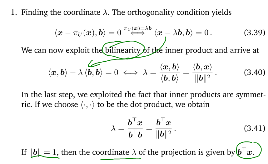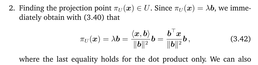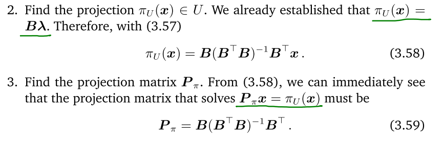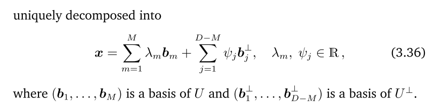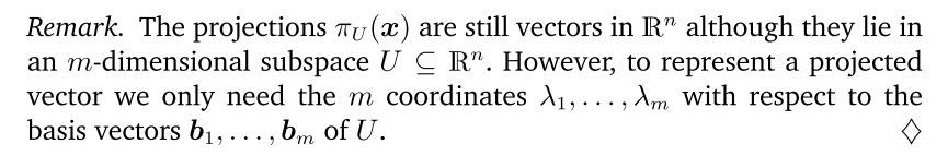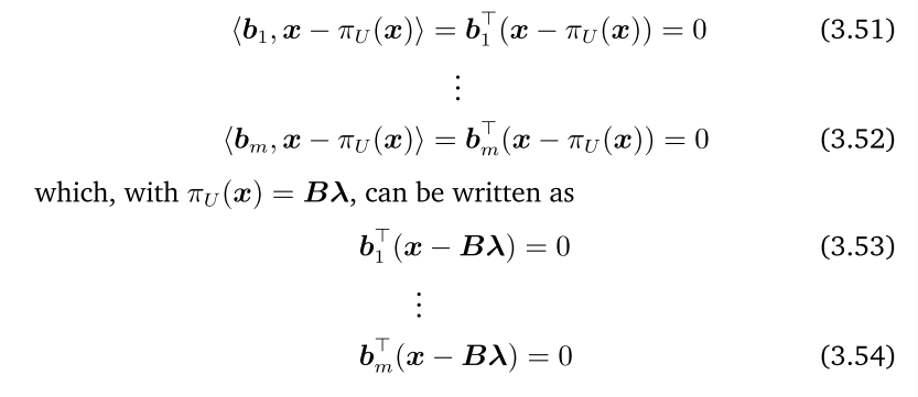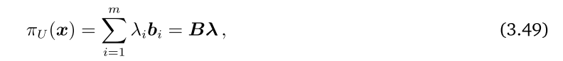 假设U有一组ordered basis \(B=(b_1,b_2,...,b_m)\),则将x投影到U中之后可以用B来uniquely得到\(\pi_U(x)\)的坐标: