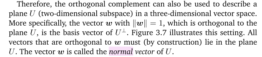 假如在三维空间中,U是一个二维平面,则与U正交的单位向量ω就是U的orthonormal complement这个子空间的basis。我们称ω是U的法向量(normal vector)。