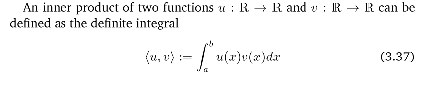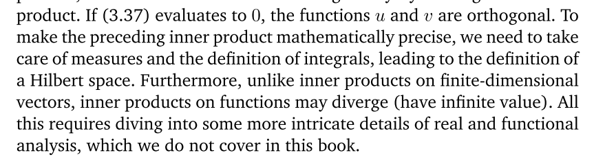 与有限维向量求inner product不同,对两个函数求inner product求积分,结果有可能diverge(无穷大),因此这里需要数学上有其他要求。但本书不涉及这些。
