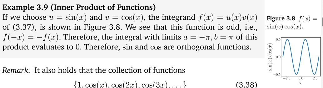 In the following, we will look at an example of inner products of a different type of vectors: inner products of functions. 我们将向量推广到函数,来讨论function之间的inner product和function之间的orthogonal。