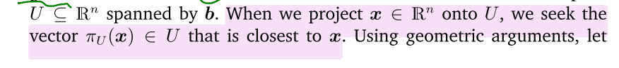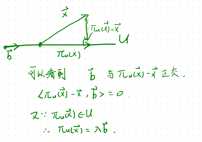 当我们将向量x投影到U时,其实就是寻找投影到U之后的向量\(\pi_U(x)\in U\)中,哪一个距离x最近。