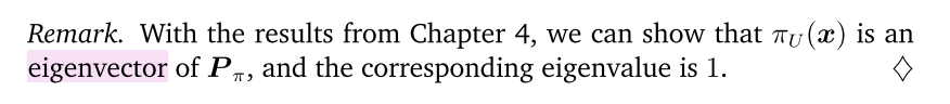 chap4将会讲到,\(\pi_U(x)\)其实是矩阵\(P_\pi\)的一个特征向量,其对应的特征值是1.
