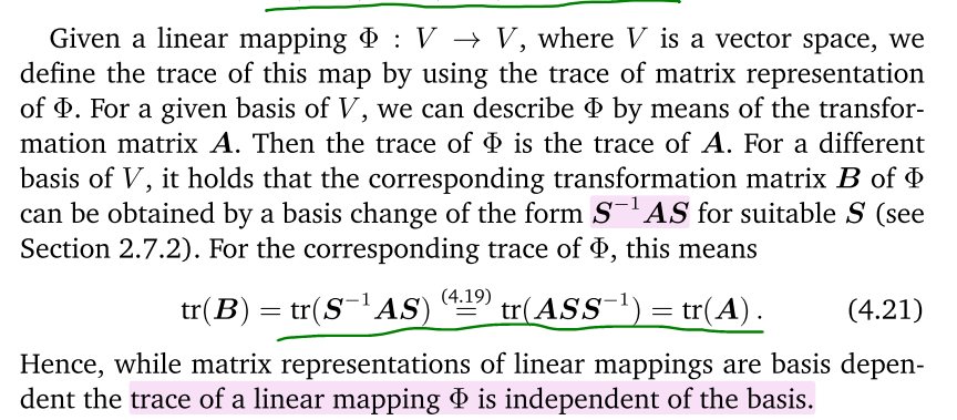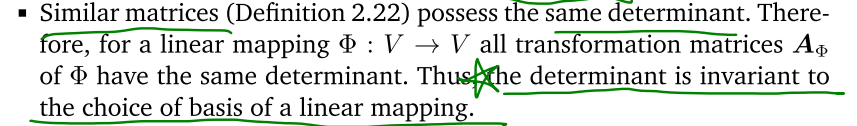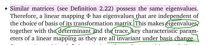 第二章提到:silimar matrix本质上描述的是同一个线性变换,只不过使用的是不同的basis,因此determinant相同。