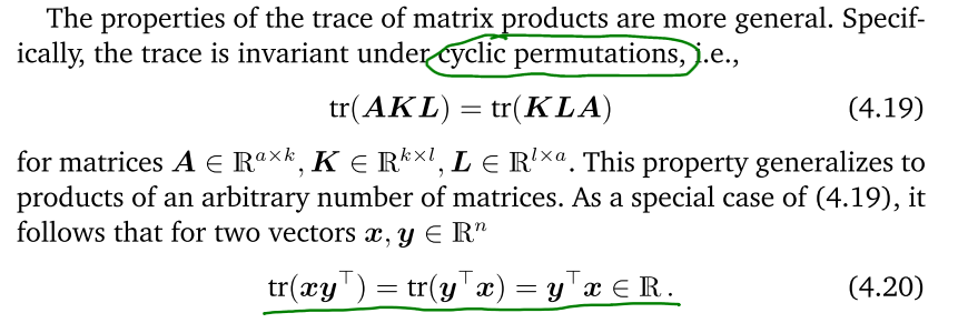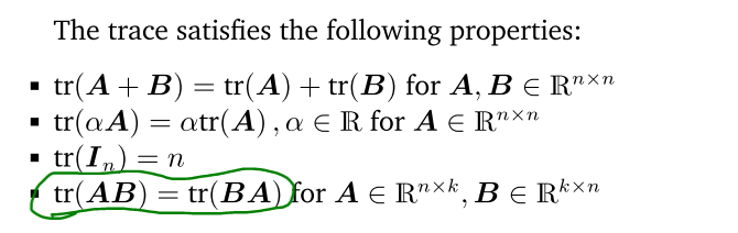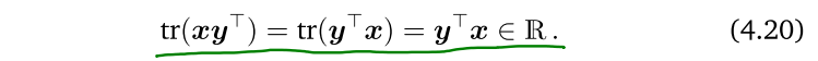 x和y都是n维向量,\(xy^T\)本身是一个n*n方阵,但这个方阵的trace可以转化为求\(tr(x^Ty)\),等于x和y的dot product \(x^Ty\)。