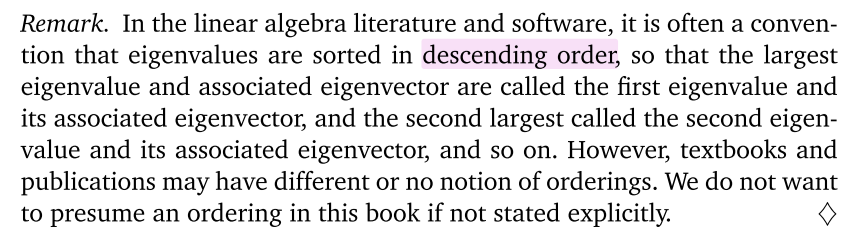 在很多地方,都是默认eigenvalue时降序排列的,但本书没有这个假设。