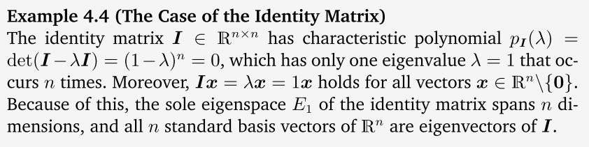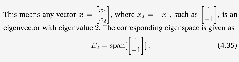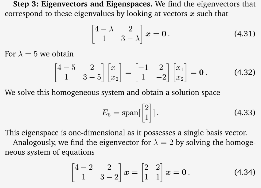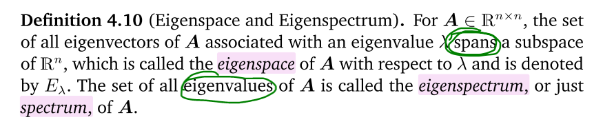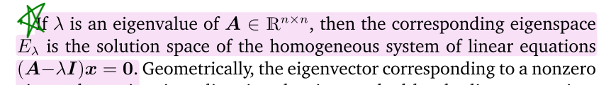 如果\(\lambda\)是A的一个eigenvalue,则\(E_\lambda\)是homogeneous system of linear equations \((A-\lambda I)x=0\)的solution space。