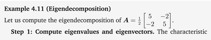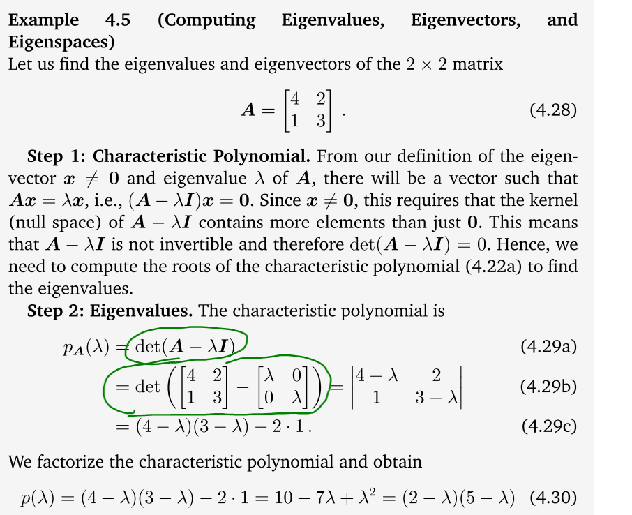 然后因为这个式子的root是eigenvalue,所以我们令\(det(A-\lambda I)=0\),然后就能解出所有的\(\lambda\).