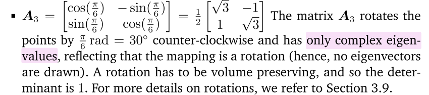 注意:对于代表旋转操作的线性变换,因为没有哪一个方向是只经过“stretch”而没有经过旋转的,因此这样的矩阵只有complex eigenvalue,而没有实数eigenvalue。