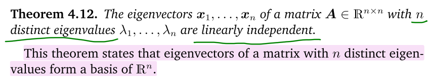 \(n\,distinct\,eigenvalues \Rightarrow n\, linear\, independent\, eigenvectors\).