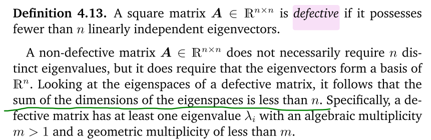 简单来说就是它线性独立的eigenvector个数小于n,或者说它的dimension of eigenspaces之和小于n。