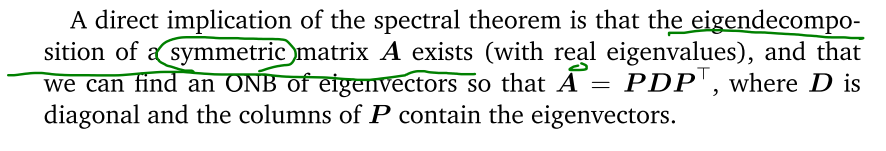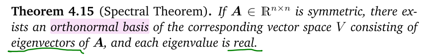 对于symmetric矩阵A,一定存在一组orthonormal 的eigenvectors作为basis,而且所有eigenvalue都为实数。