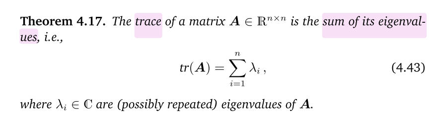 trace也不随basis变换而改变,那么tr(A)=tr(D)。而tr(D)对角线上的元素就是eigenvalue,因此得到上面这个式子。