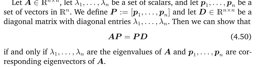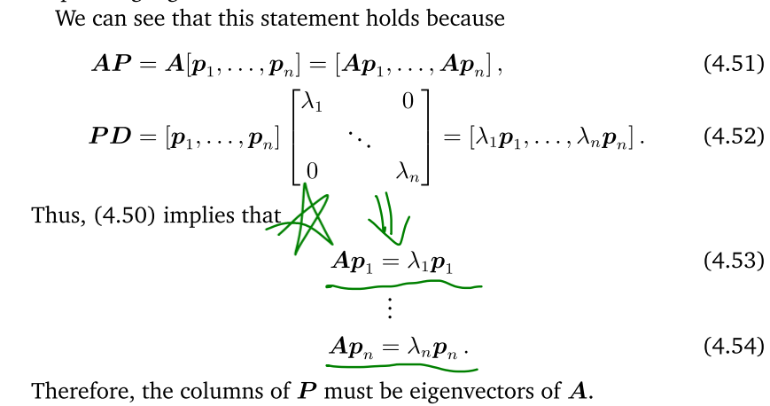 将\(AP=PD\)展开,然后令等式两边对应相等,正好能得到很多组\(Ap_i=\lambda_i p_i\),因此解得的向量是eigenvector,解得的\(\lambda\)是eigenvalue。