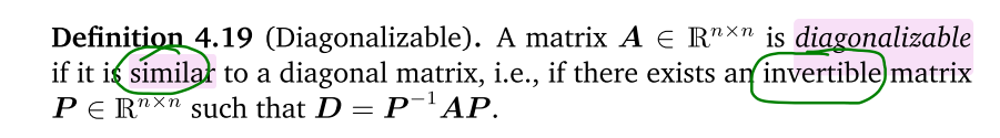 之前提到过如果有\(D=P^{-1}AP\),则A与D similar。 现在我们只关注D是diagonal matrix、而且对角线上的元素都是A的eigenvalue的情况。