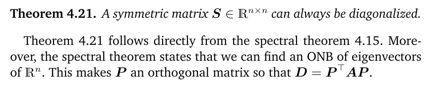 P的columns是orthonormal的eigenvectors,因此P是orthogonal matrix,P regular,因为P的column已经orthogonal了就一定linear independent。此外因为P是orthogonal的,有\(P^T=P^{-1}\).