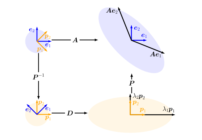 \(e_i\)和\(p_i\)是两组不同的basis,其中\(p_i\)和D搭配使用时,可以看到经过D变换之后,沿着\(p_i\)的方向都是只有被伸缩,而没有旋转。