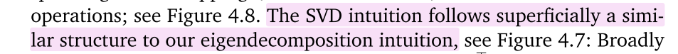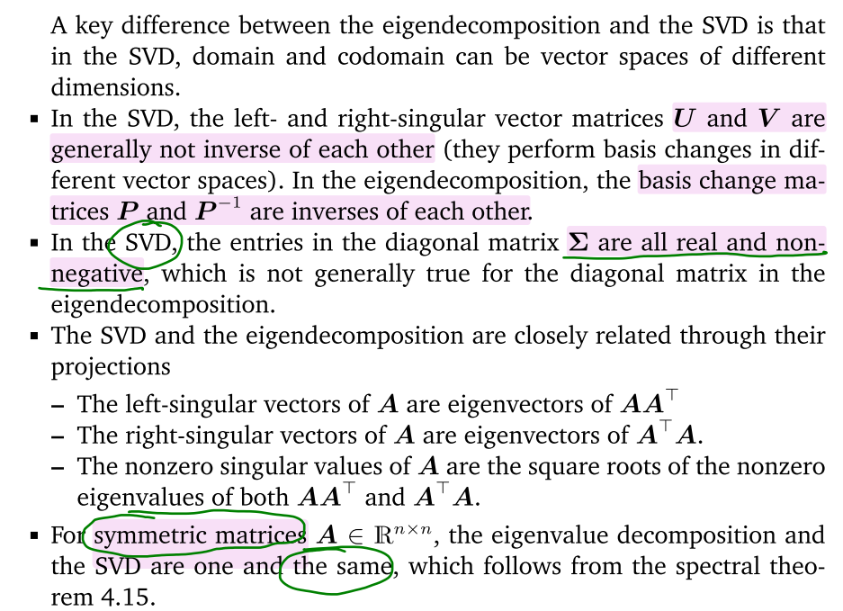 - SVD的U和V之间一般没有inverse关系(而且可能连shape都不一样)。eigendecomposition的\(p\)和\(P^{-1}\)成inverse关系。