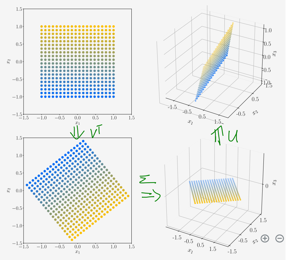 - scaling and augmentation (or reduction) in dimensionality via the singular value matrix \(\Sigma\).
