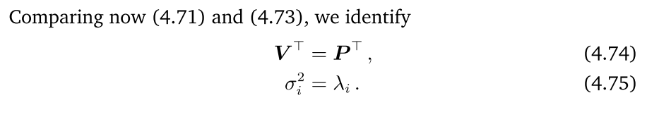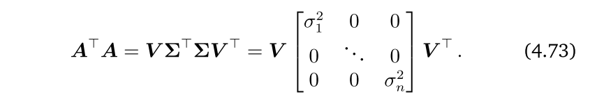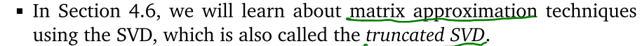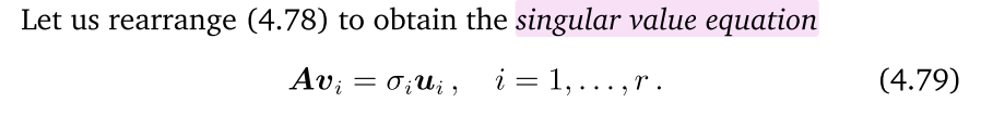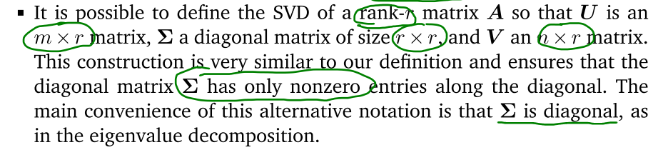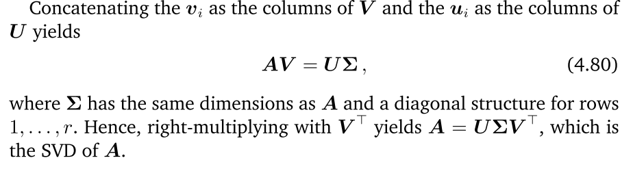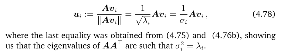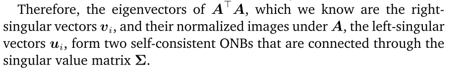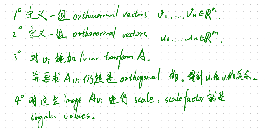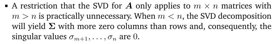 注意上面式子中\(v_i\)是n维。\(u_i\)是m维。如果只看上面这个式子的话,感觉\(v_i\)和\(u_i\)中维度更高的那一方,只有一部分值受到了约束。 比如n=6, m=4,向量\(v_i\)比\(u_i\)长,上面的式子只展示了向量\(v_i\)的前4维等于啥,并没说后2维需要满足什么条件。但经过之前的SVD推导过程,我们知道\(v_i\)本身还需要是orthonormal的。