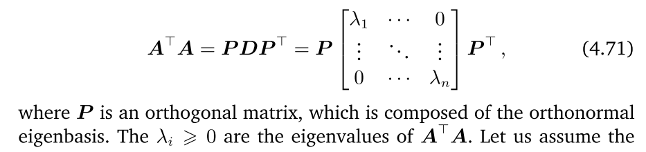 symmetric矩阵的eigendecomposition一定存在。 我们可以将A分解为\(A=PDP^T\), where D is diagonal and the columns of P contain the eigenvectors.